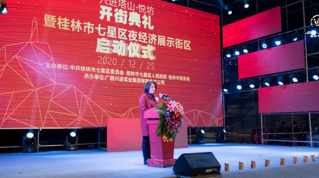 在現(xiàn)場熱烈氛圍下,七星區(qū)人民政府鄭平區(qū)長上臺擔(dān)任此次啟動儀式的嘉賓主持,她表示悅坊開街標(biāo)志著塔山片區(qū)城中村?棚戶區(qū)改造項目建設(shè)再次取得新突破,也將對激活七星區(qū)夜間消費市場、助力桂林國際旅游勝地建設(shè)、填補區(qū)域文旅娛樂產(chǎn)業(yè)發(fā)展空白,產(chǎn)生重要影響。