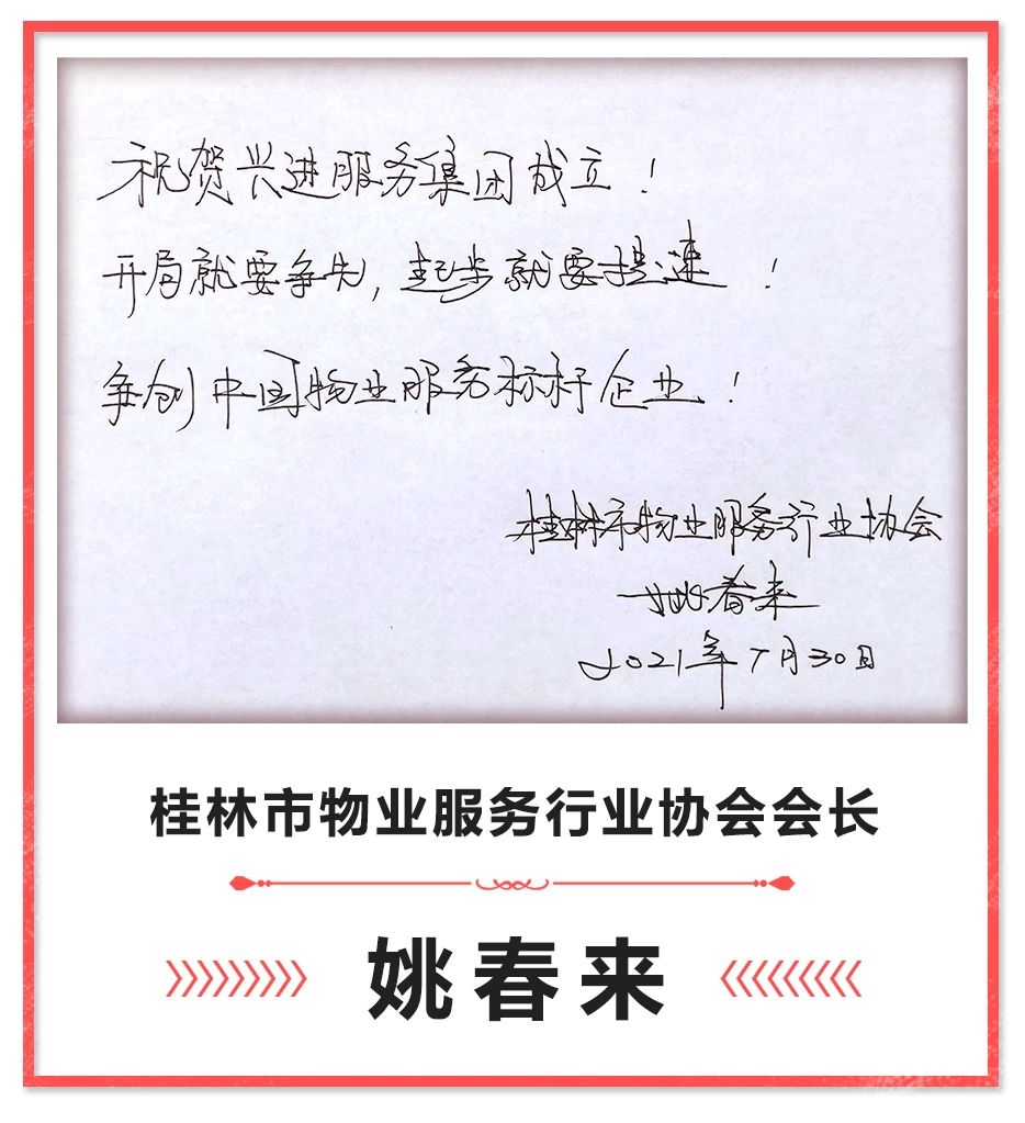 2021年8月1日,桂林市興進(jìn)物業(yè)服務(wù)有限責(zé)任公司正式更名為廣西興進(jìn)物業(yè)服務(wù)集團有限責(zé)任公司,在興進(jìn)物業(yè)成立20年之際,象征著又朝公司"5年計劃"邁進(jìn)一步。