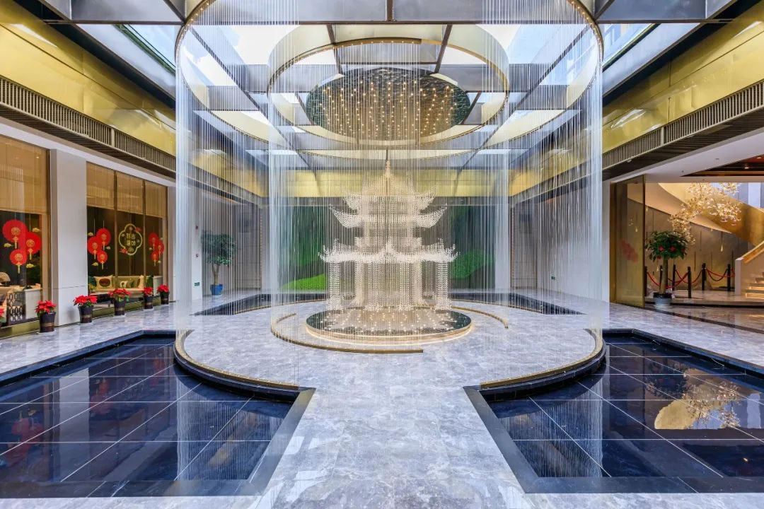 江山樾主打新中式風(fēng)格,以金色為主基調(diào),采用了王府的規(guī)制,將廡殿頂作為屋頂結(jié)構(gòu),并大量使用云紋、回形紋、山形紋等中式符號。