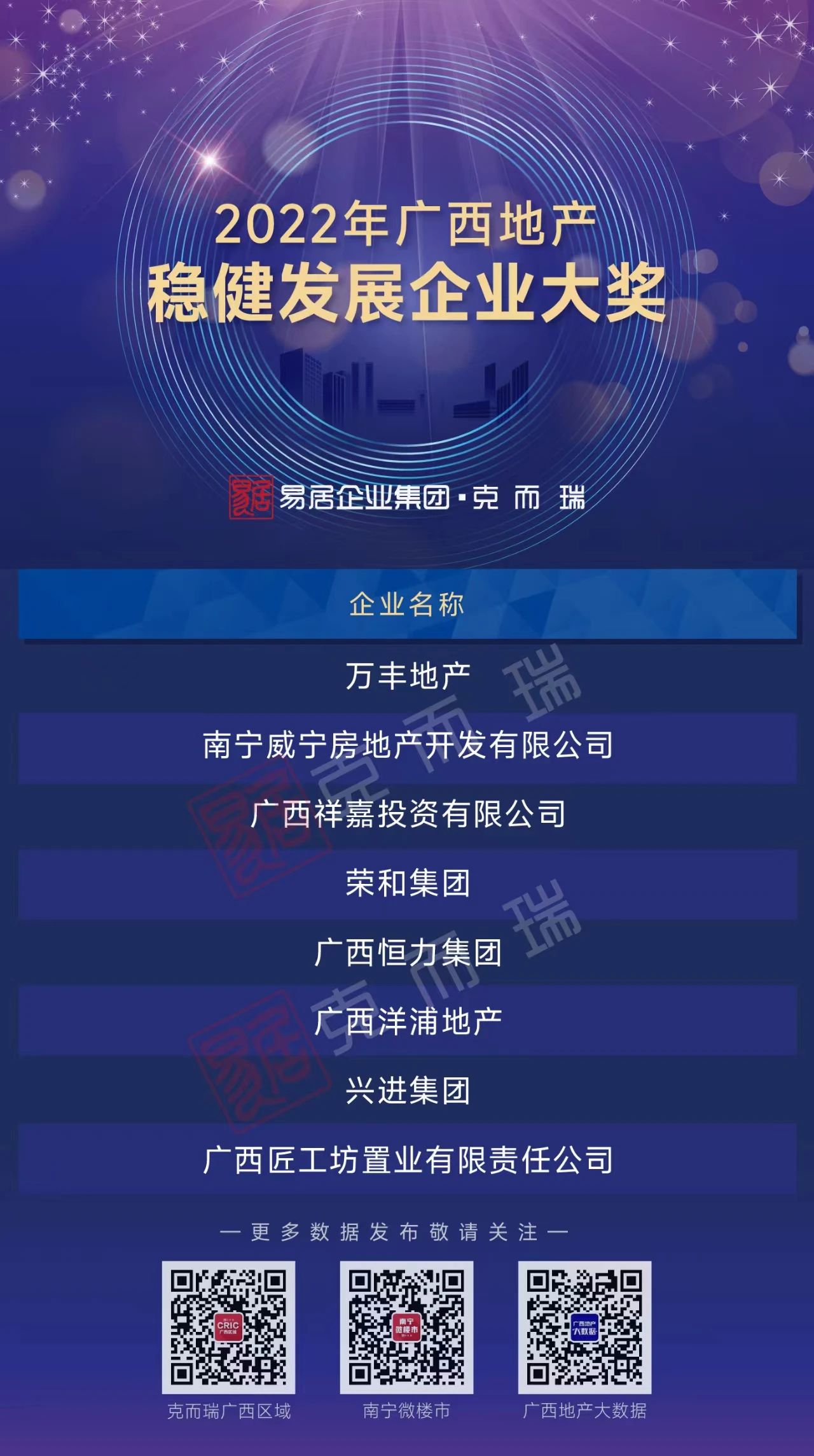 興進(jìn)集團(tuán)憑借穩(wěn)健經(jīng)營和市場的高度認(rèn)可,榮獲廣西地產(chǎn)穩(wěn)健發(fā)展企業(yè)大獎(jiǎng),同時(shí)入圍"2022年廣西房地產(chǎn)本土房企權(quán)益銷售金額"TOP20榜單,位列第三;興進(jìn)·漓江郡府榮獲"2022年廣西地產(chǎn)各市縣標(biāo)桿項(xiàng)目"獎(jiǎng)項(xiàng)。