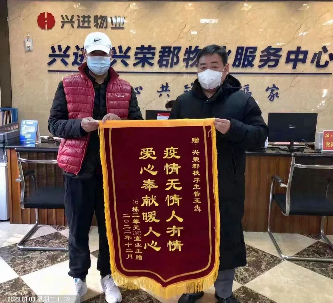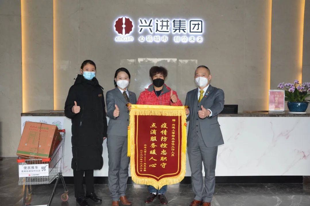 在2022年底,興進(jìn)業(yè)主邵先生因?yàn)樵谕獾毓ぷ?,父母年紀(jì)大了,在家生病而無人照顧。接到業(yè)主求助后,興進(jìn)物業(yè)王主管積極地幫助老人送物資送藥,像家人一樣照顧他的父母,邵先生工作結(jié)束回來后,看到興進(jìn)物業(yè)人的盡心盡力的付出,十分感動,特意制作了一面錦旗表達(dá)感謝。