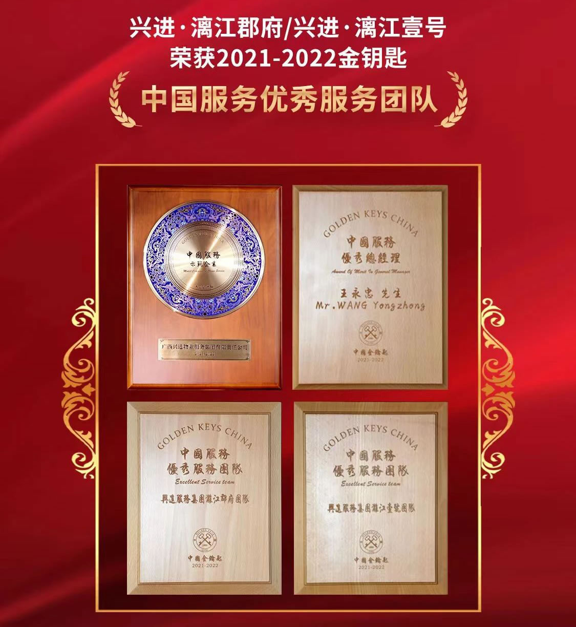 在年終收官之際,經(jīng)中國(guó)金鑰匙總部綜合評(píng)定,興進(jìn)服務(wù)集團(tuán)被評(píng)為2021-2022年度金鑰匙國(guó)際聯(lián)盟"中國(guó)服務(wù)示范企業(yè)",集團(tuán)總經(jīng)理王永忠先生獲"優(yōu)秀總經(jīng)理"稱號(hào),興進(jìn)漓江郡府、漓江壹號(hào)獲"優(yōu)秀服務(wù)團(tuán)隊(duì)"榮譽(yù)稱號(hào)。